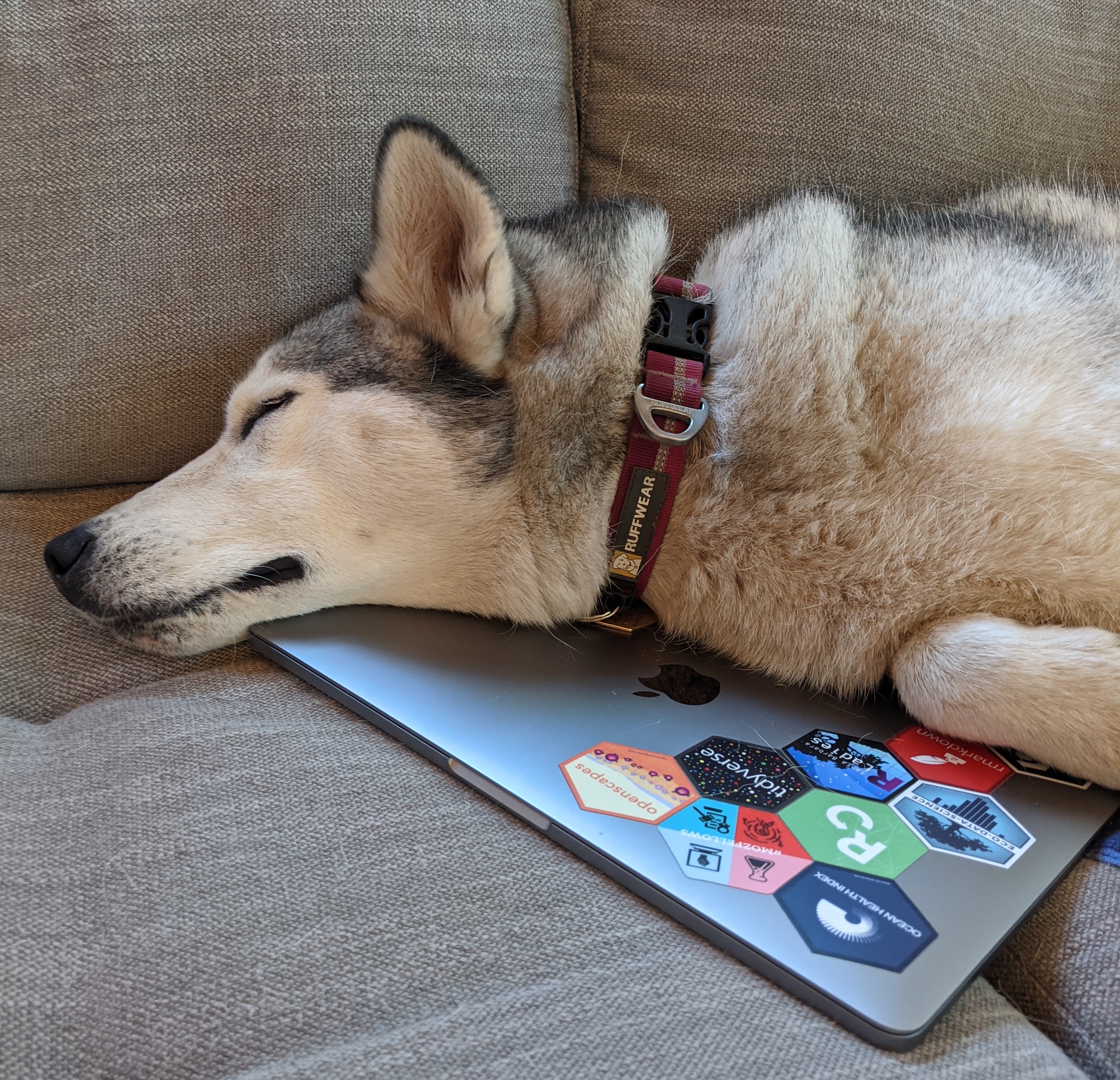 We have physical stickers we share with our community. These hex stickers are something from the R (#rstats) community that we put on laptops, waterbottles, etc. These are a visible part of community building - Julie Lowndes has made friends with people at airports through them seeing her laptop and coming to start a conversation.