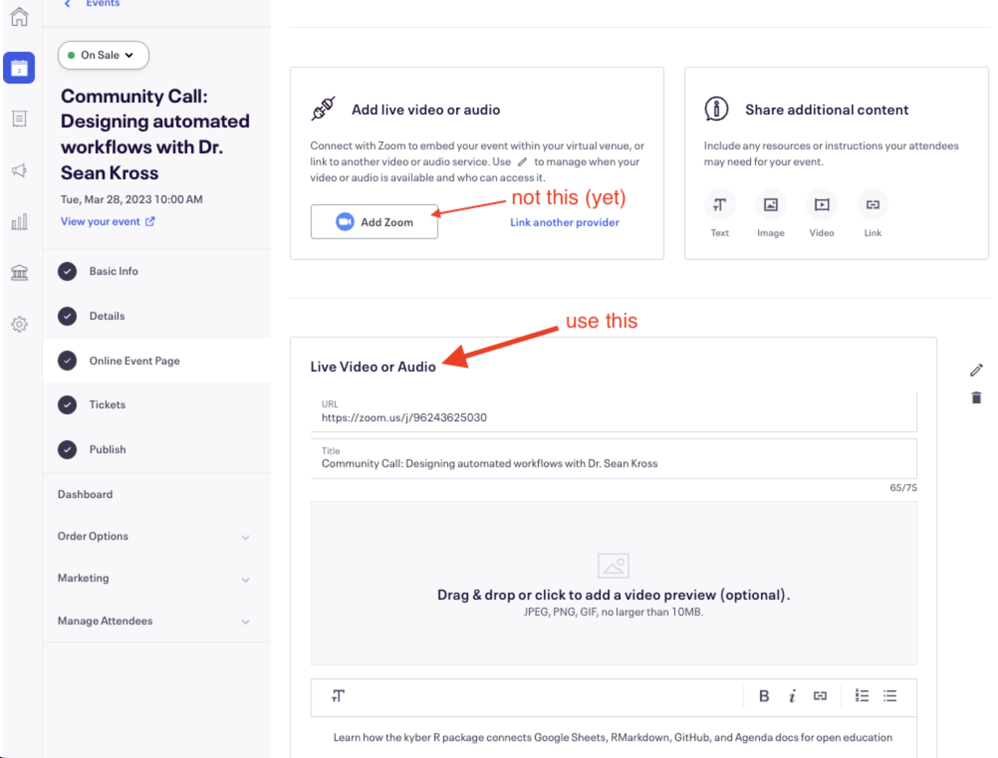 In Eventbrite, create Event > copy Zoom link into Eventbrite > Event > Online Event Page > Live video or audio, instead of “Add Zoom”